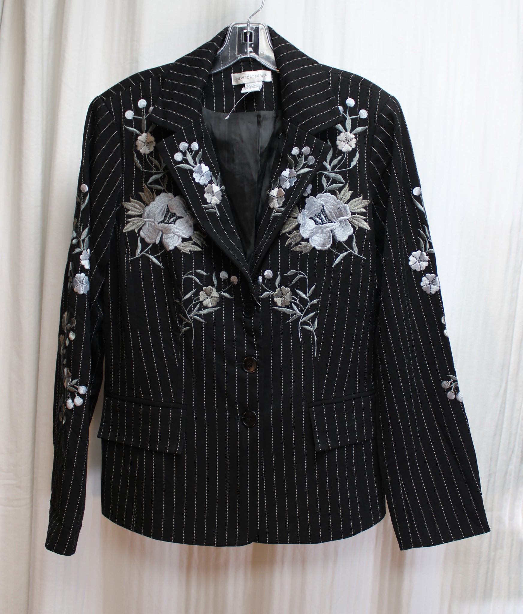 Newport News - Black Pinstripe w/ Blue, Gray Floral Embroidery 3 Button Blazer