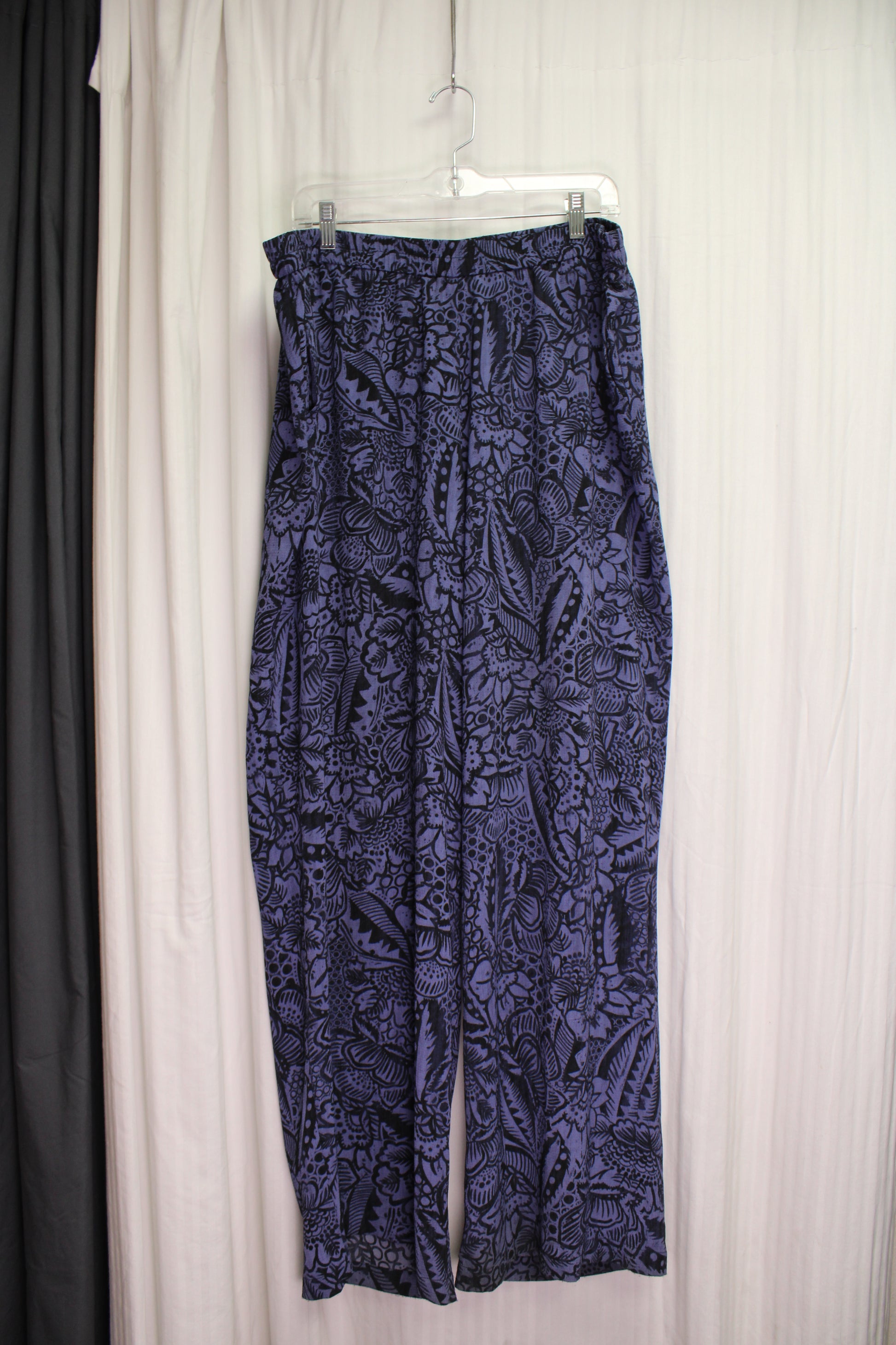 Blue and black floral pattern wide leg pants with an elastic waistband.