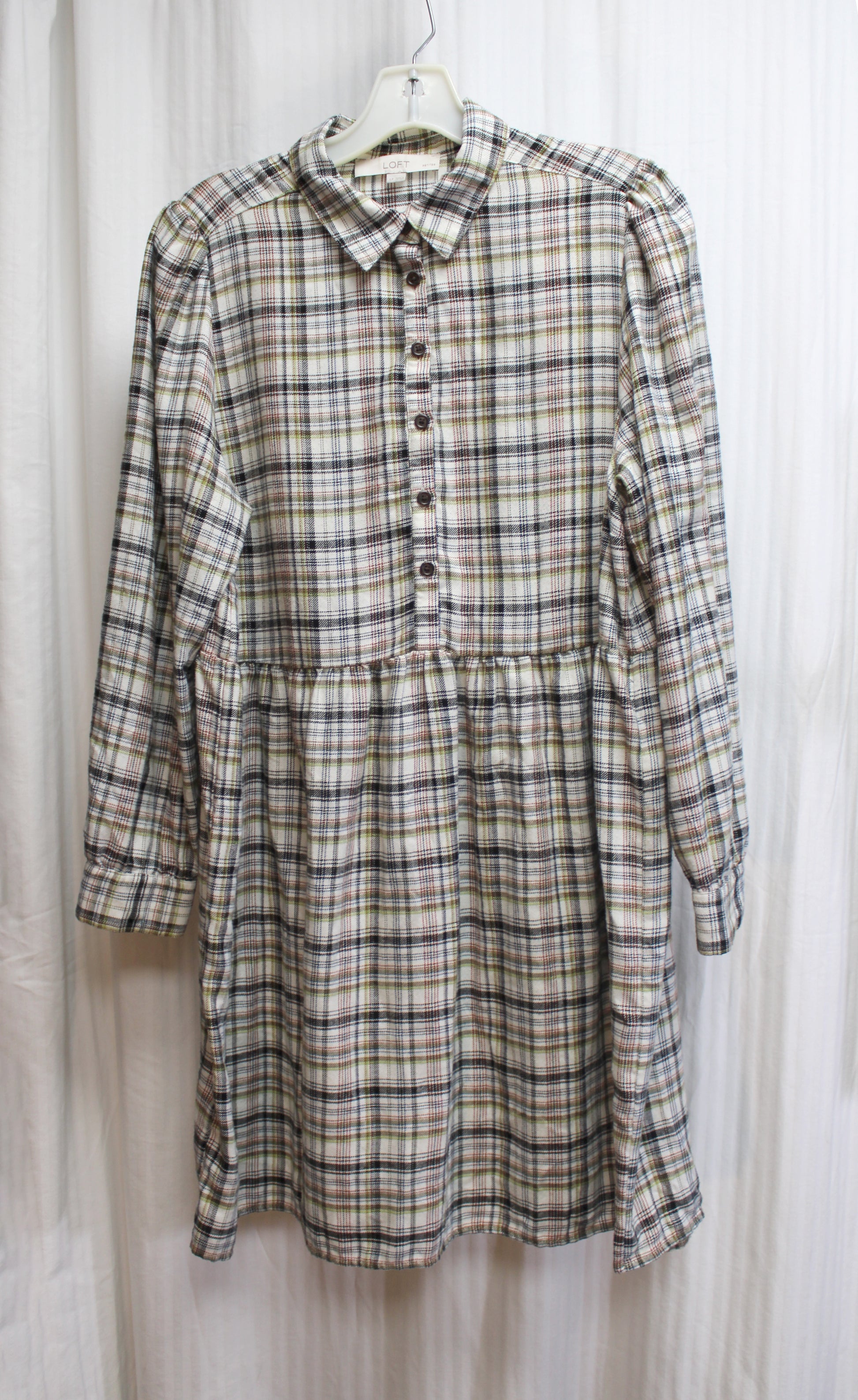 Loft - Flannel, Earth Tone Plaid Long Sleeve Short Dress - Size L Petite