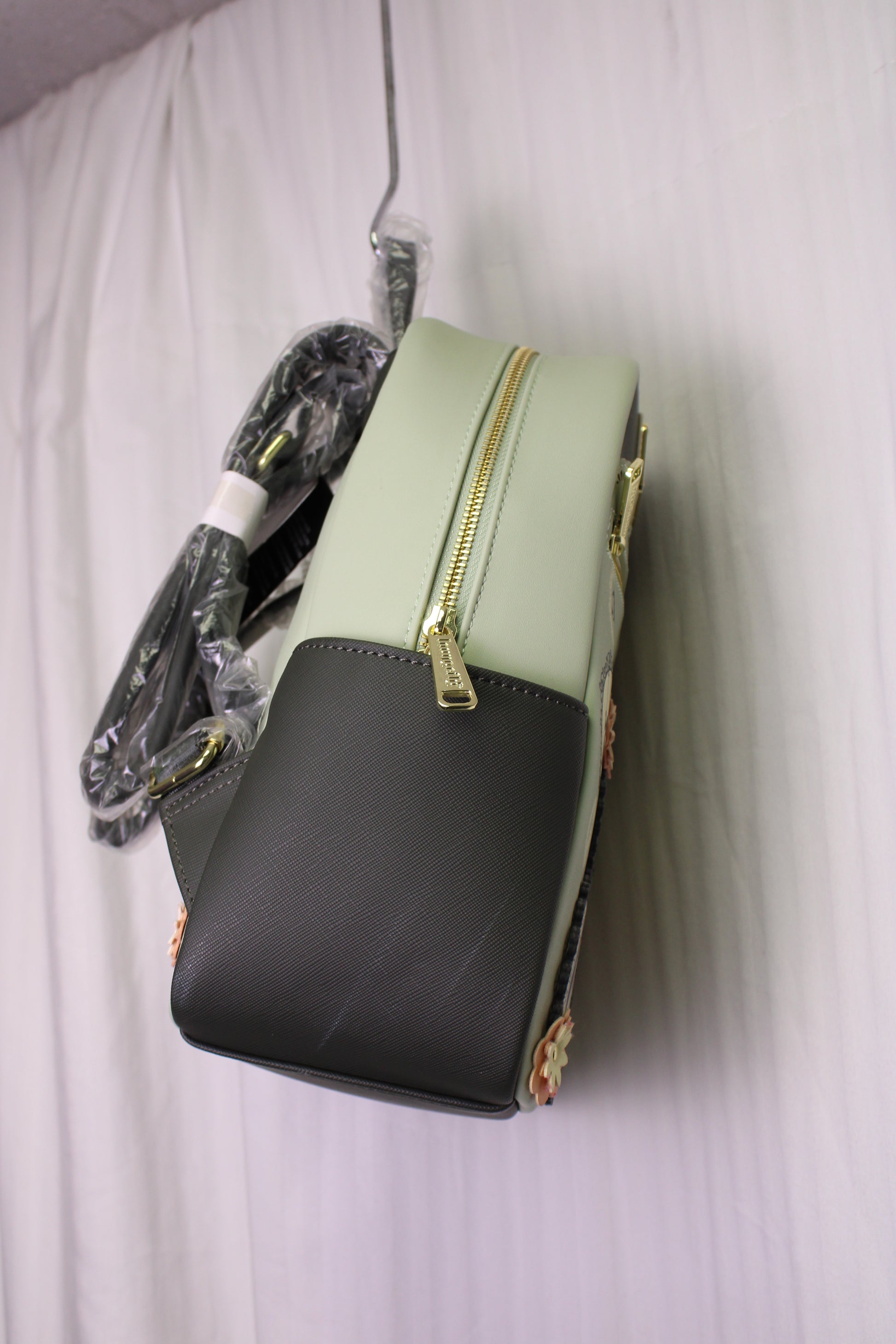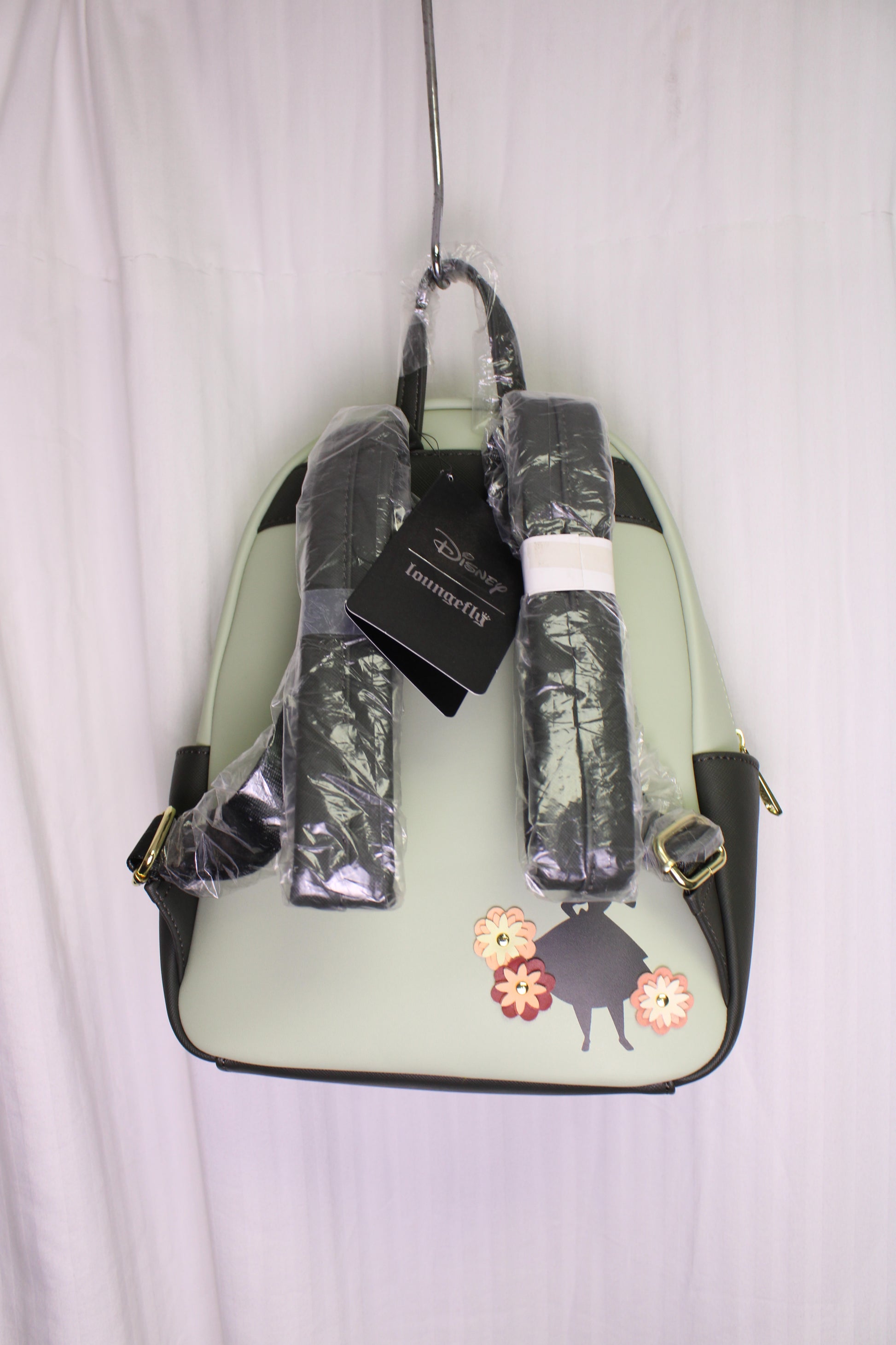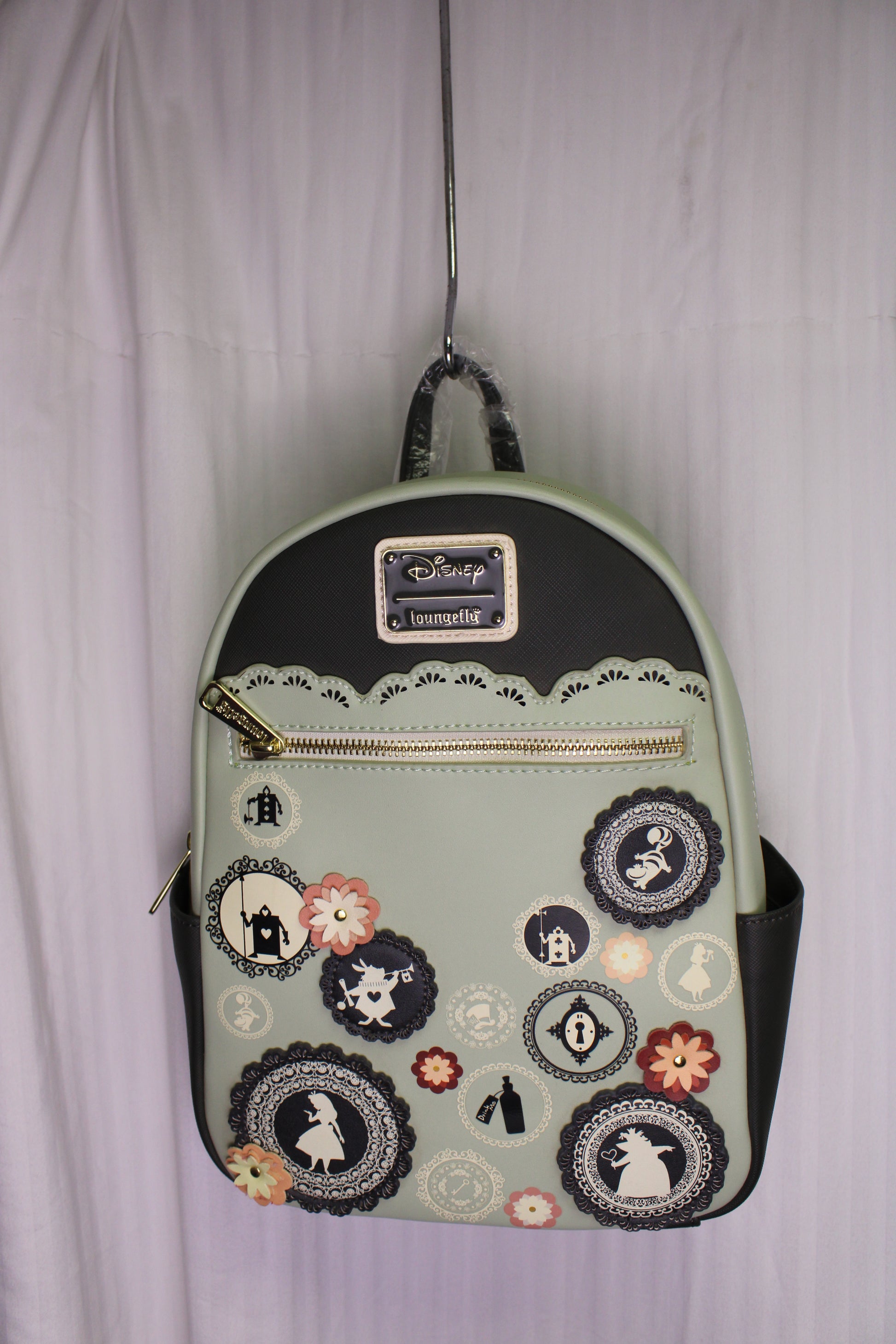 A BoxLunch exclusive loungefly: Inspired by the animated Disney classic, Alice in Wonderland, this Loungefly mini backpack features die-cut appliqués and printed silhouette portraits of Alice, the Cheshire Cat, the White Rabbit, and more Wonderland friends in doily-like frames. Complete with scalloped doily details towards the top, gold-toned hardware, two side pockets, adjustable shoulder straps, and flower appliqués with a Alice silhouette on the back, you'll never be late for another important date whenever you carry all of your belongings in this Disney bag!