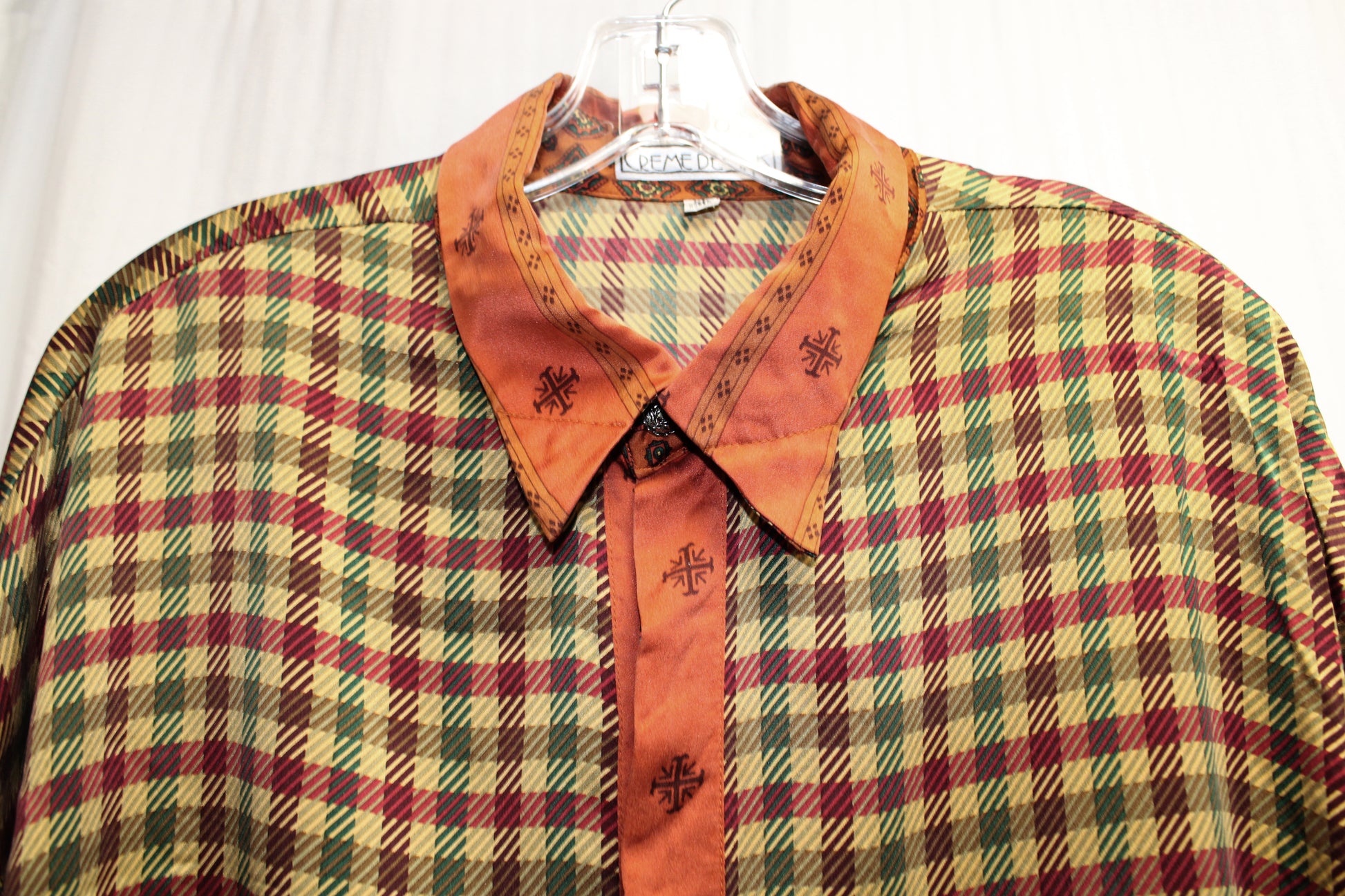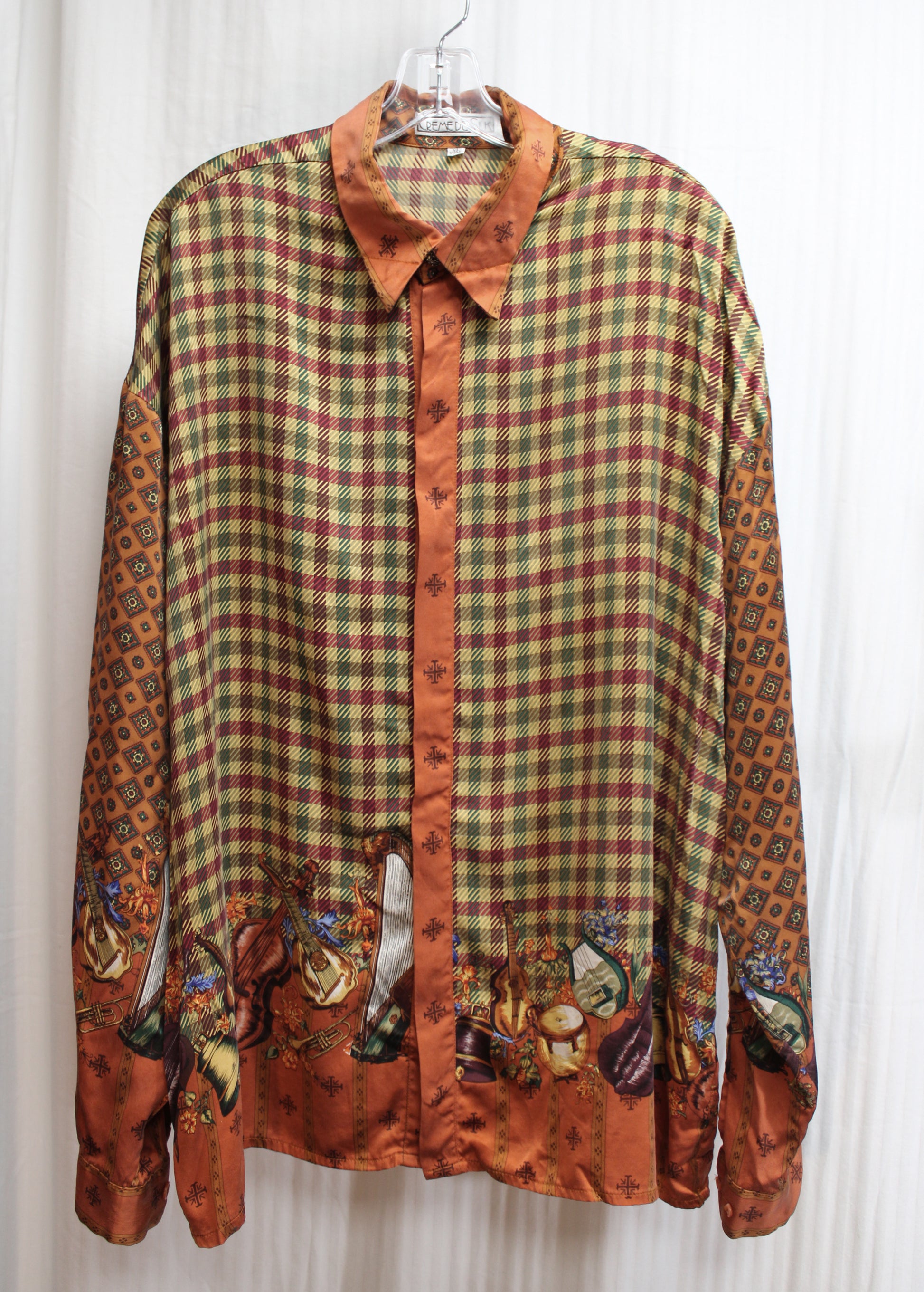 Men's - Creme De Silk - Reds, Gold & Green 100% Silk Plaid w/ Contrast Sleeves & Musical String Instruments, Hidden Front Button Placket Shirt - Size XL