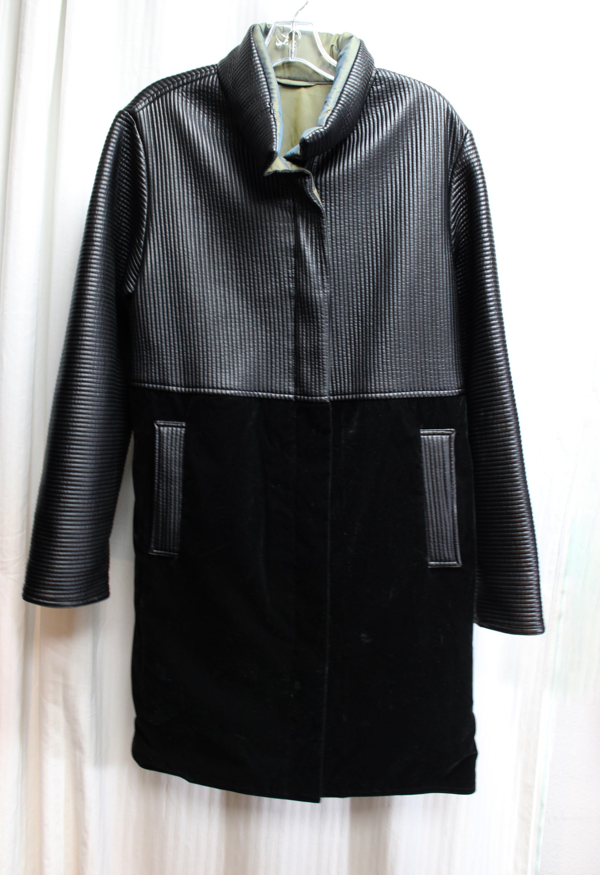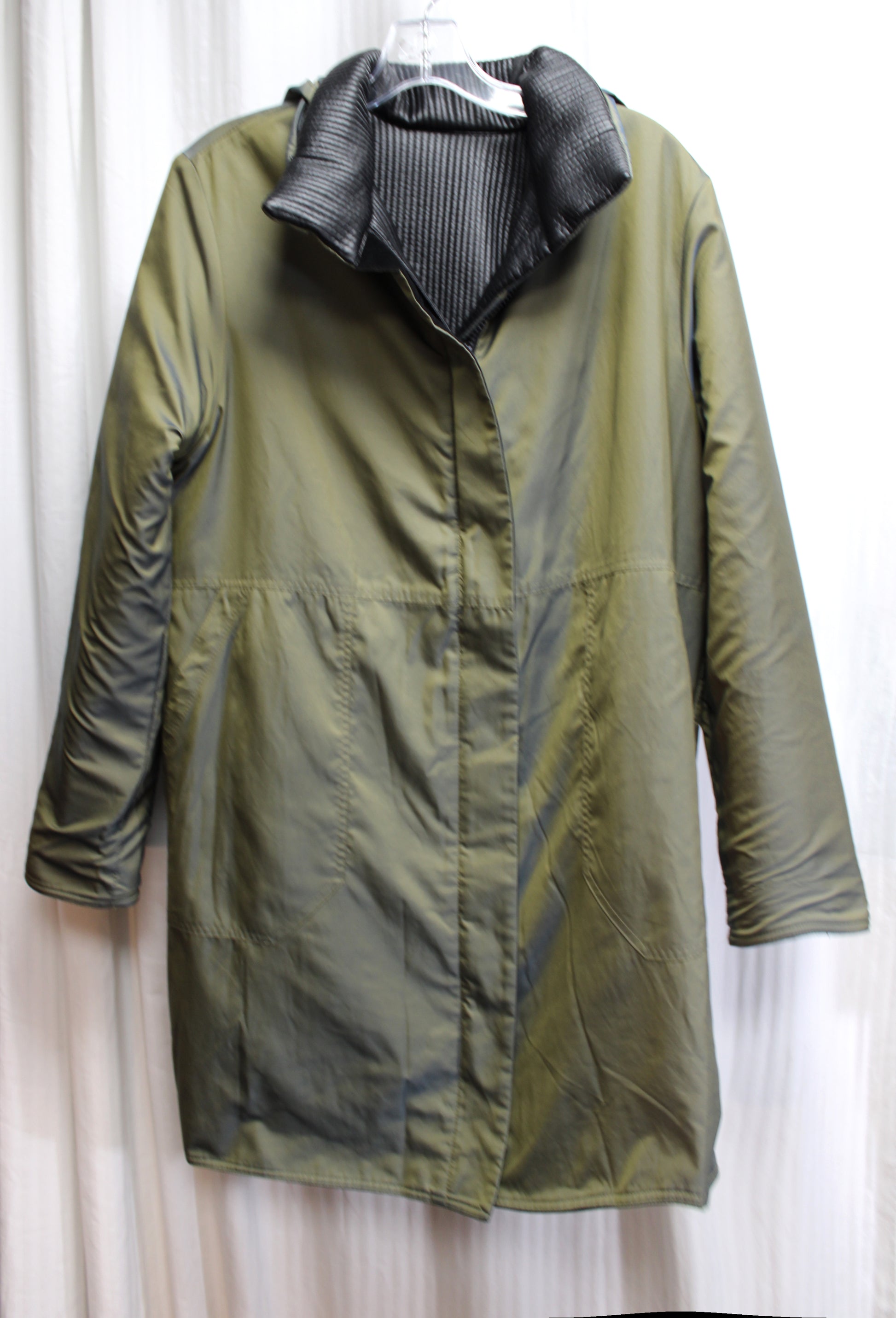 Mycra Pac - Reversible, Black Velvet & Ribbed / Olive Green & Blue Color Shift Shot Hideaway Hood Coat - Size 1 = Small/Medium