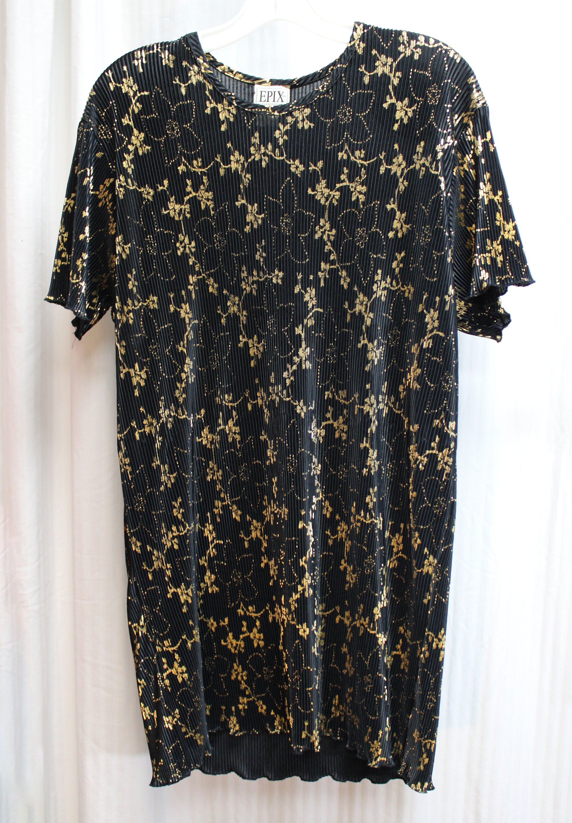 Vintage - Epix - Black& Gold Metallic Foil, Micro Pleated Tunic/ Mini Dress