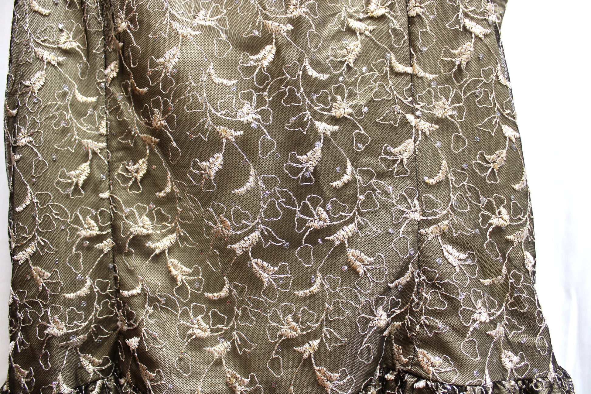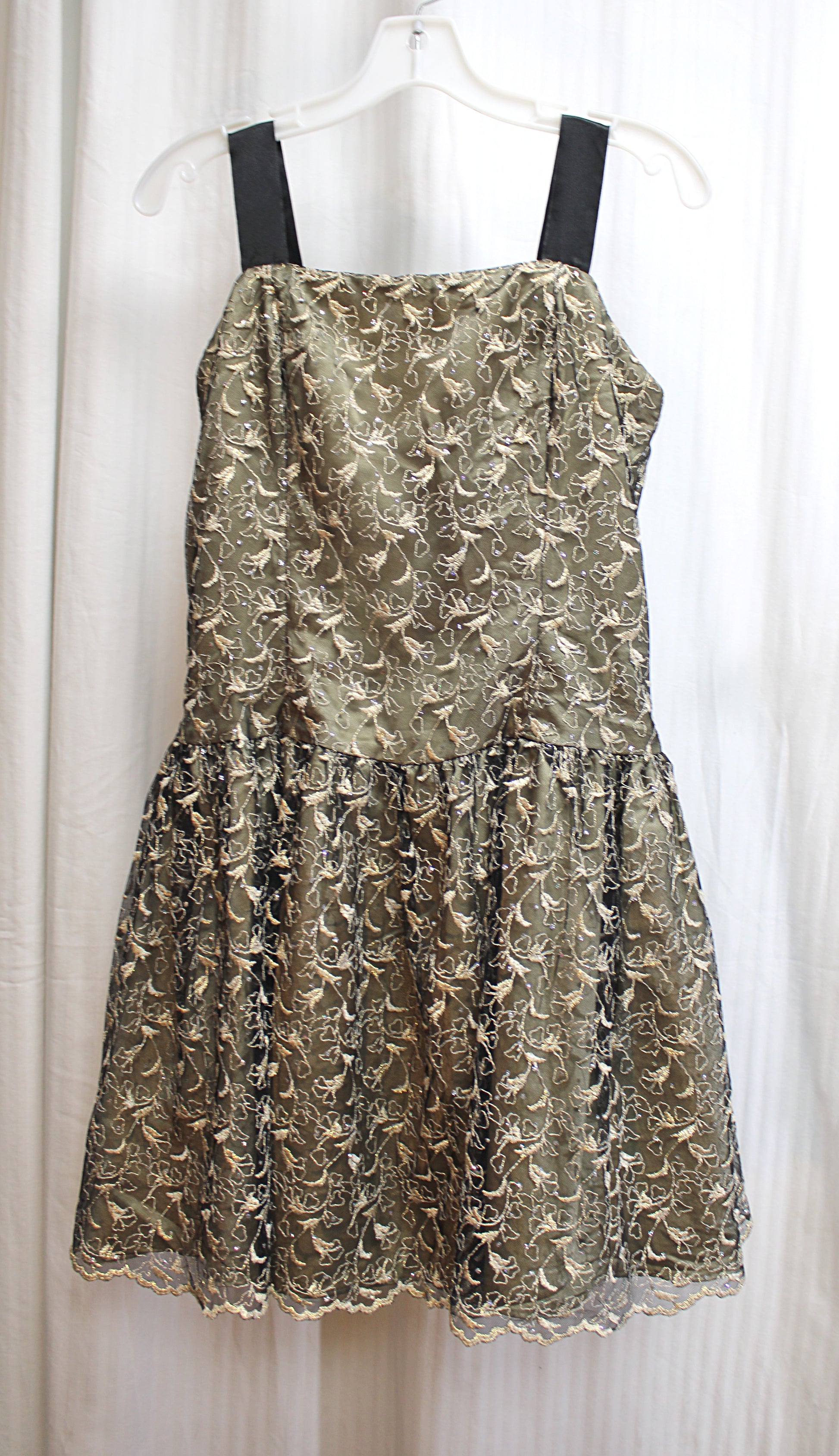 Vintage - Jessica McClintock - Black w/ Embroidered Gold Floral Lace Over Gold Satin Party Mini Dress - See Measurements 29" Waist