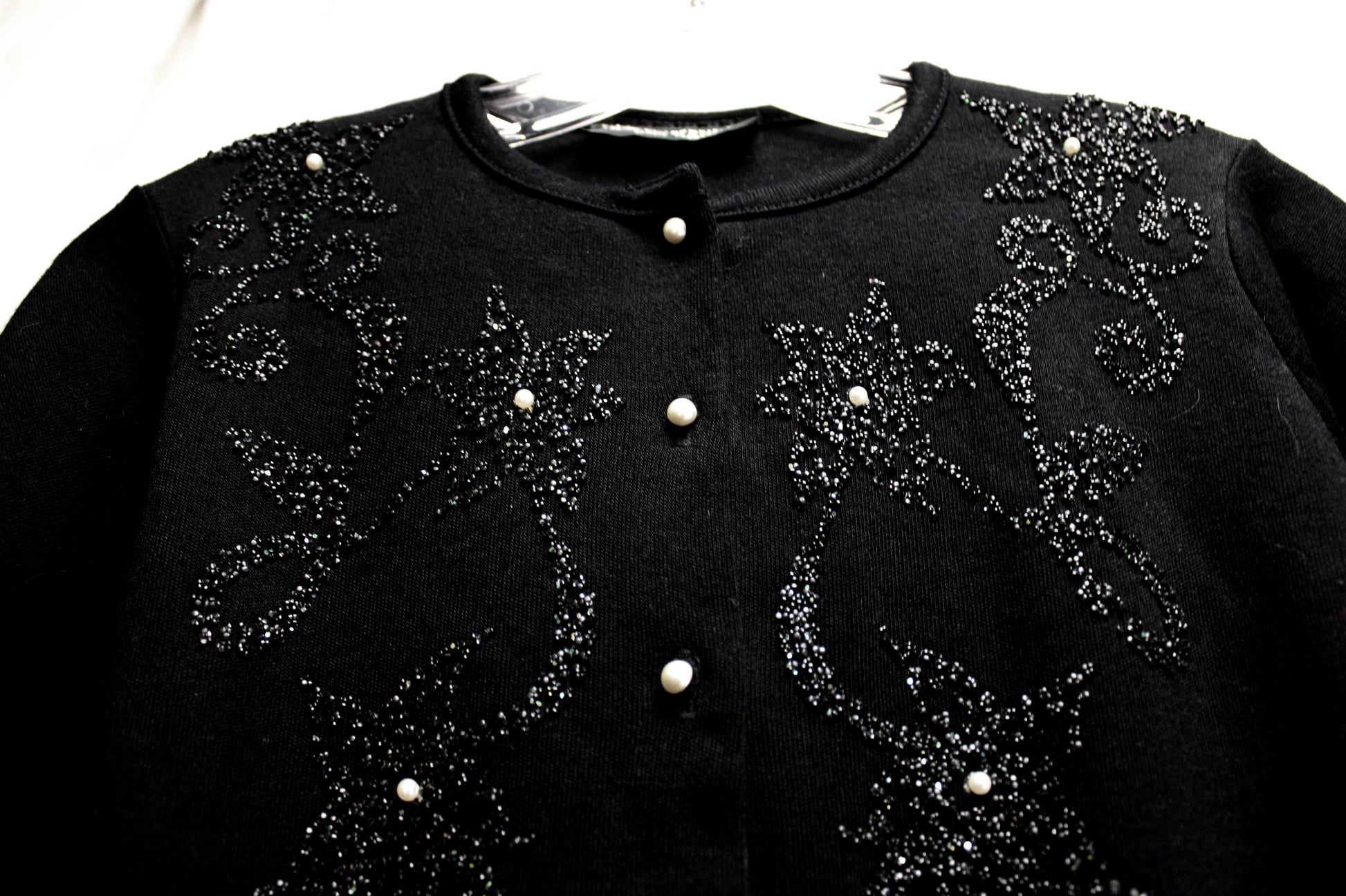 Vintage - Kitty Hawk - Black 3/4th Sleeve Crystal Encrusted w/ Pearl Accents Cardigan Sweater