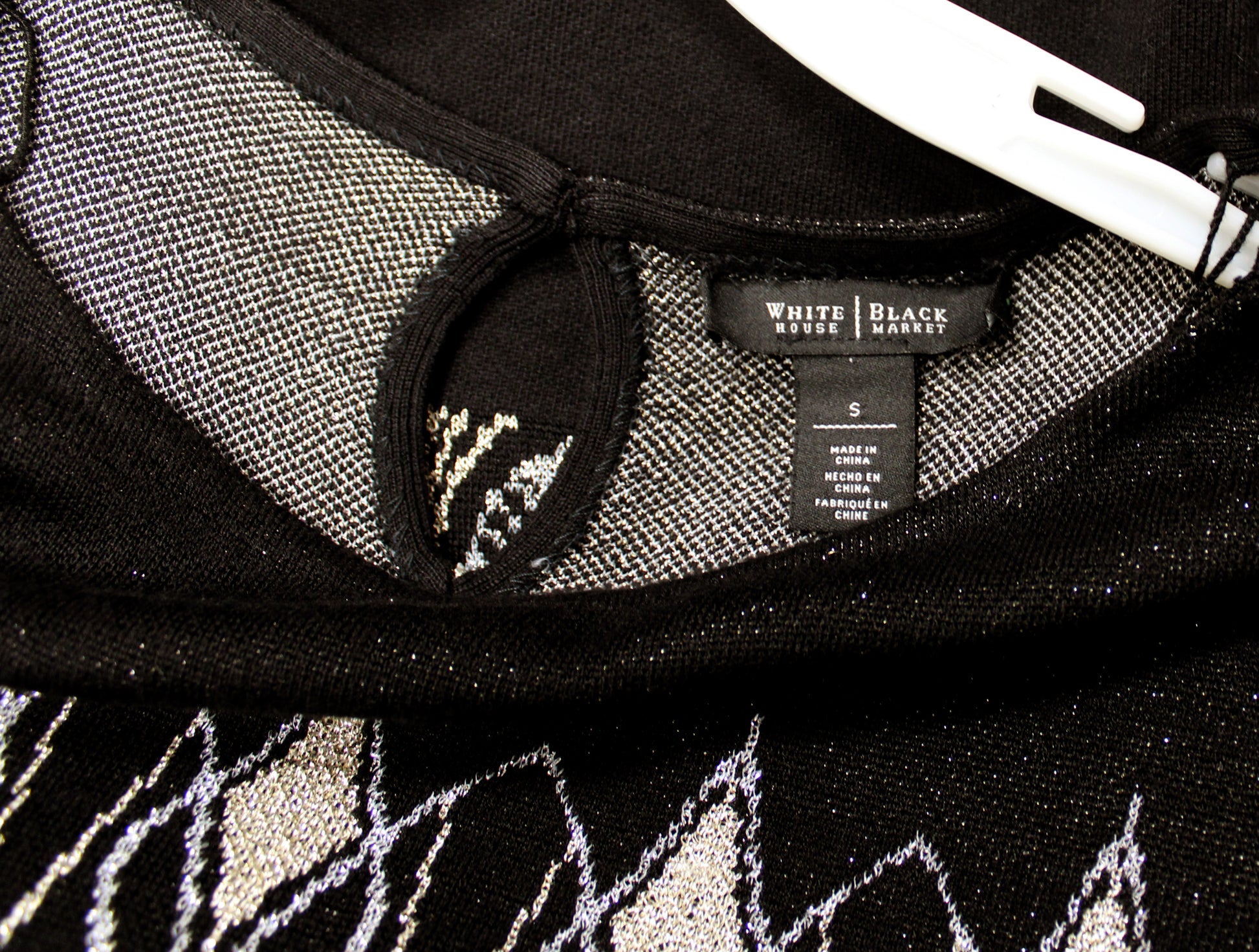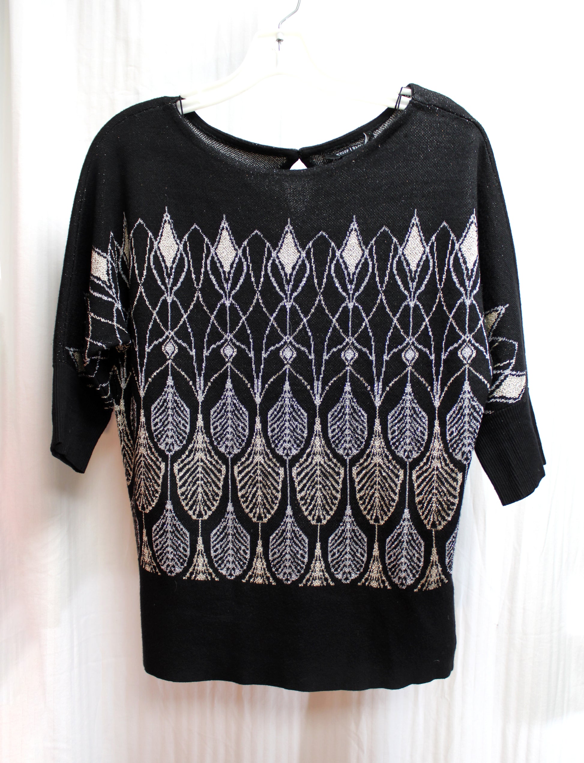 White House, Black Market - Gorgeous Black, Silver & Gold Metallic Design 3/4th Sleeve Sweater Top - Size S